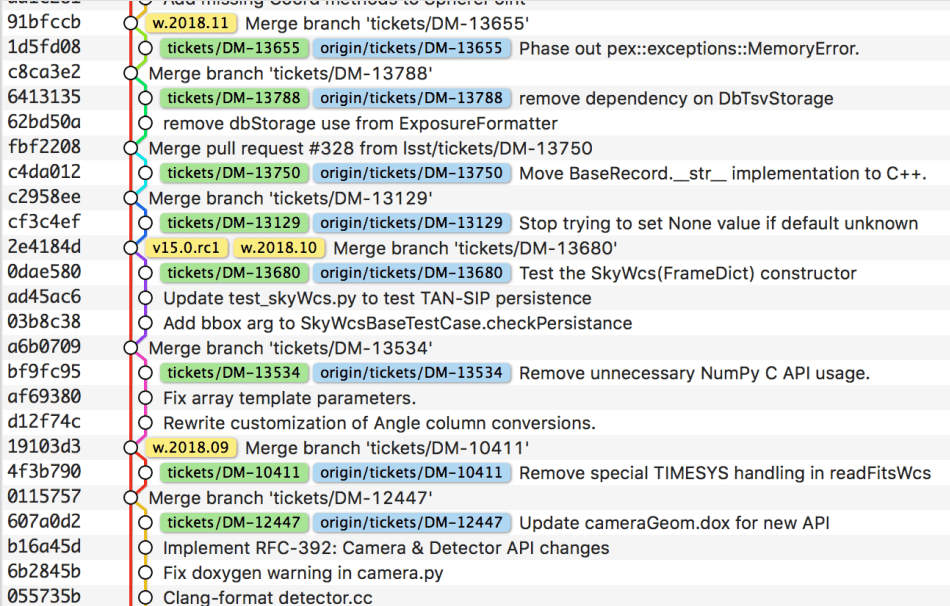 The figure below shows what the git history looks like for a typical Science Pipelines package.